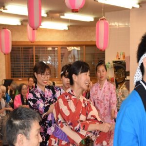 毎年恒例! 盆踊り! 太鼓に合わせて、はっぴ姿のご利用者様と 汗をかきながら 楽しく踊りました。 各階の工夫をこらした出し物も大盛況! 1階 『さかなつり』 2階 『輪投げ』 3階 『すいか割り』 練乳とあ …続きを読む